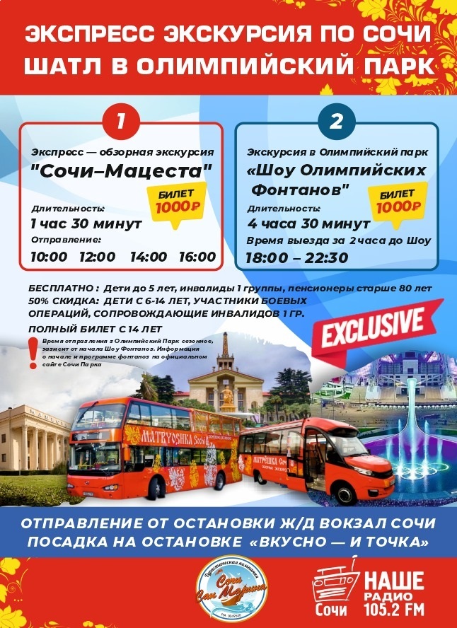 Обзорная экскурсия на автобусе кабриолете "Матрёшка", это незабываемые впечатления. Сердце курорта Сочи-это центральная историческая часть города с морем на фоне и Бальнеологический курорт Мацеста.