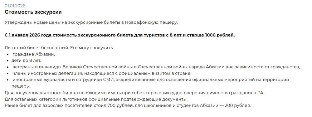 Ранее билет для взрослых посетителей стоил 700 рублей, для школьников и студентов Абхазии — 200 рублей.